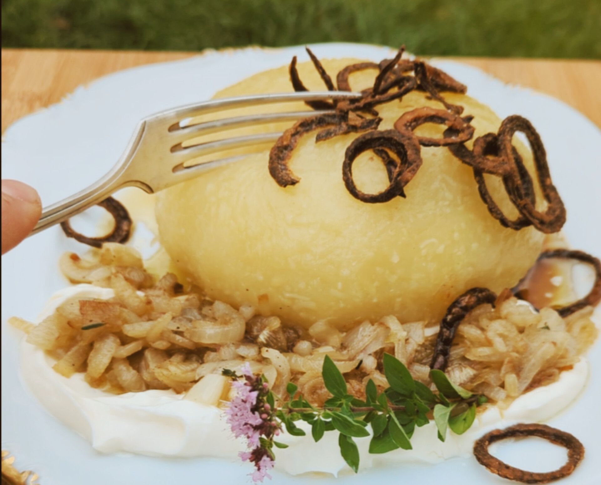 Während wir uns auf die Reise ins Baltikum vorbereiten, lädt das sommerliche Wetter zum draußen kochen ein. An einem sonnigen Sonntagmorgen finden also ein gutes Stück Rind und eine Schweinehaxe im Dutch Oven zusammen – und aus Feuer und Rauch entsteht Pulled Pork & Beef Bolognese Style. Das erinnert mich an eine im Reiseführer erwähnte Spezialität aus Litauen: „Cepelinai“ (litauisch für „Zeppeline“) sind üppige, gefüllte Kartoffelklöße und ein litauisches Nationalgericht. Und es funktioniert - Cepelinai lassen sich hervorragend mit Pulled Pork & Beef füllen. Dazu gibt es ganz traditionell gebratene Zwiebeln und Sauerahm.